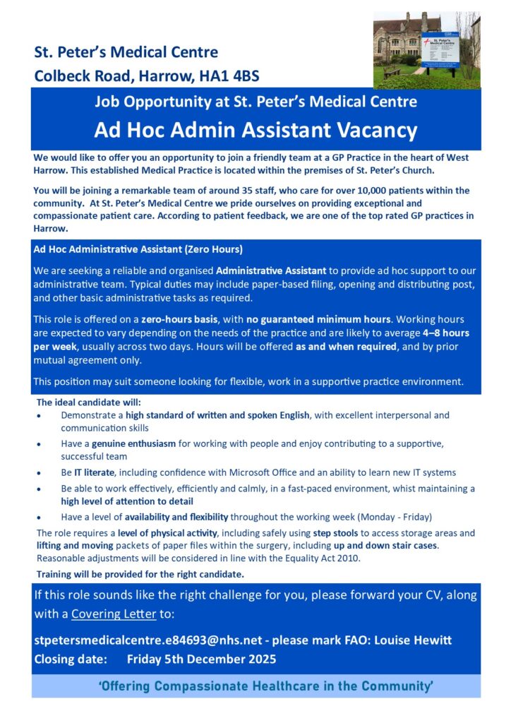 Please note that it is our policy that employees cannot be patients at our practice, anyone offered a job here who is already registered as a patient would be required to register at an alternative GP surgery.